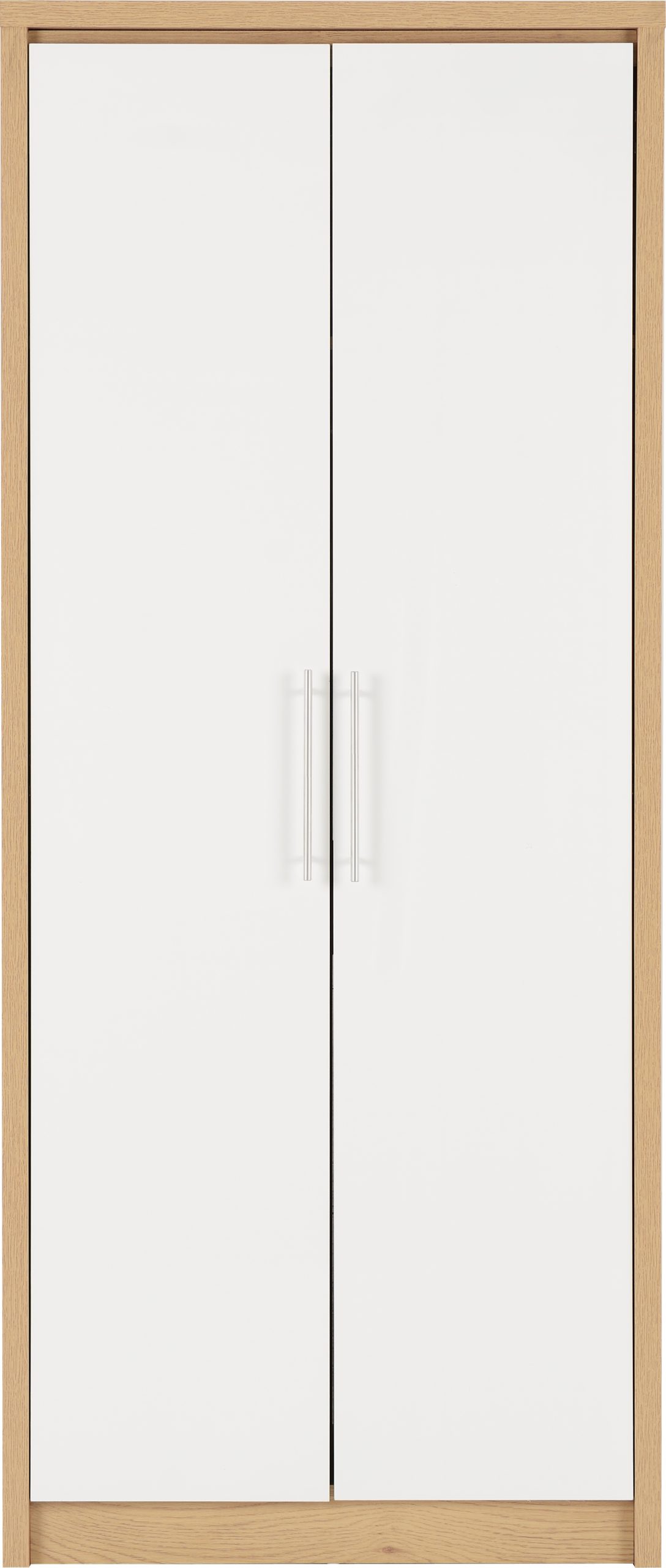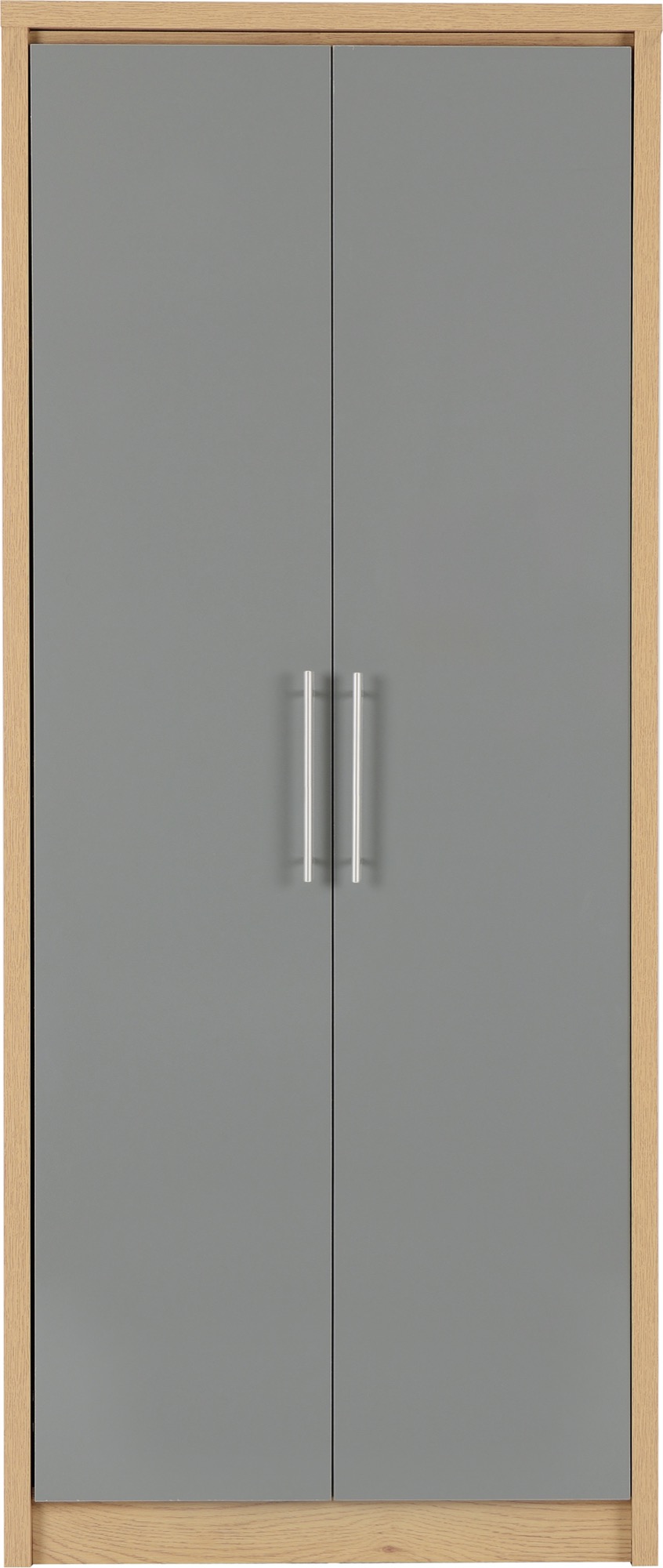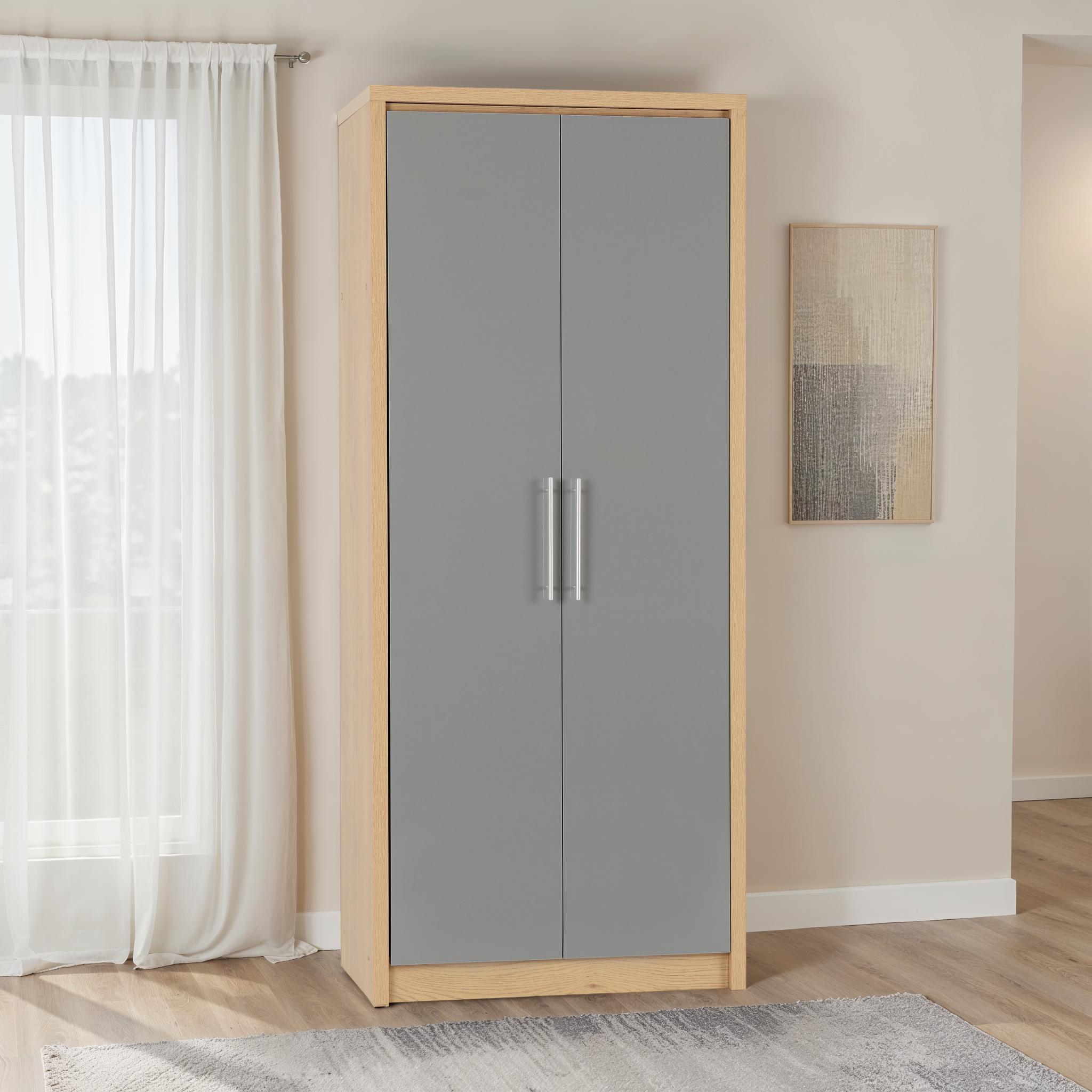 • This Seville 2 Door Wardrobe has a light oak effect veneer frame; the door and drawer fronts have high gloss white or grey veneer.