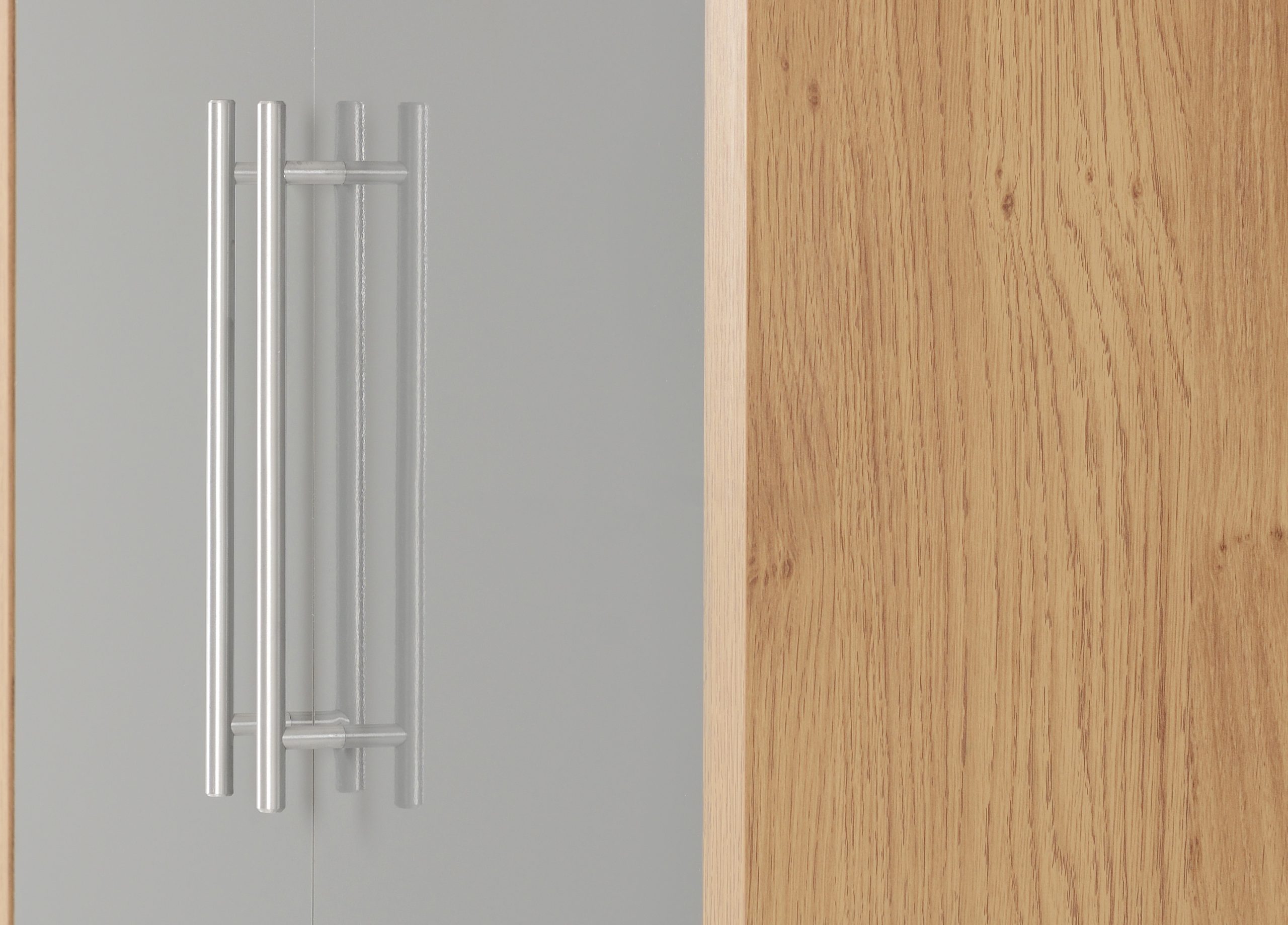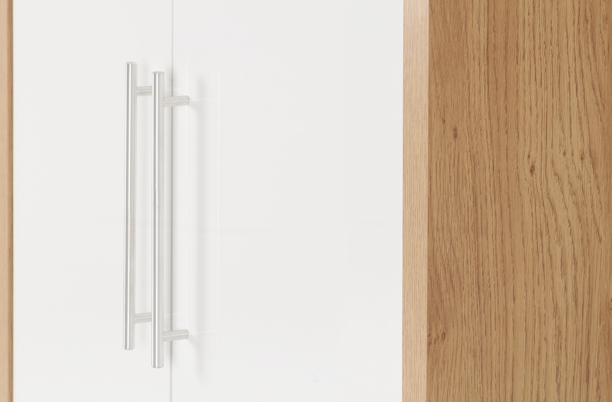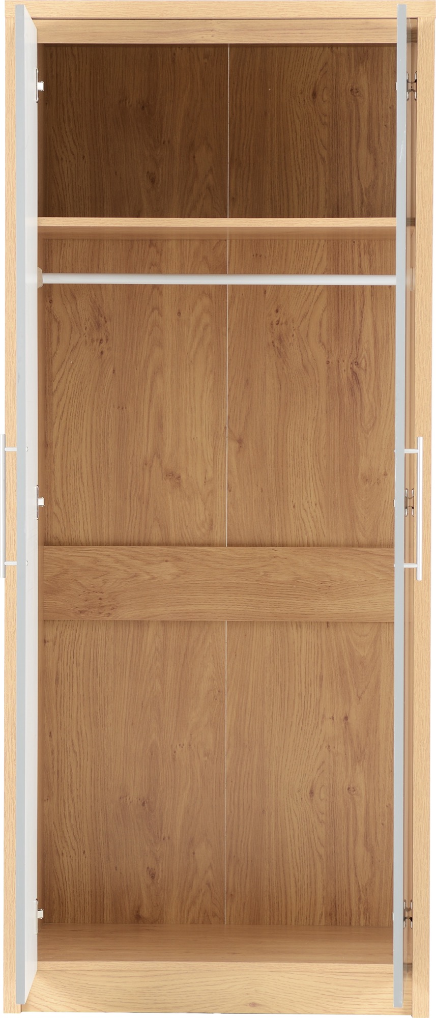 • This Seville 2 Door Wardrobe has a light oak effect veneer frame; the door and drawer fronts have high gloss white or grey veneer.