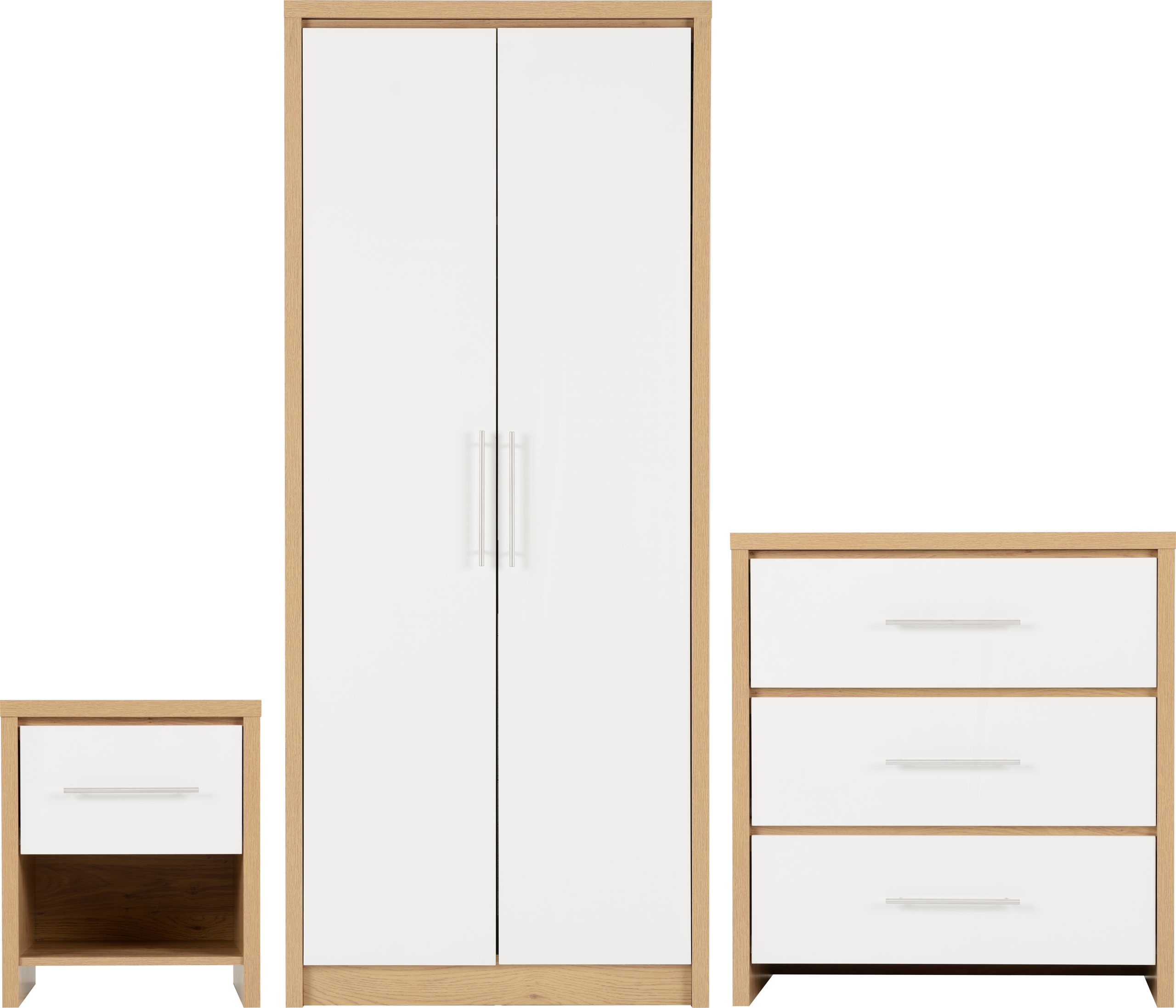 • This Seville bedroom set has a light oak effect veneer frame; the door and drawer fronts have high gloss white or grey veneer.