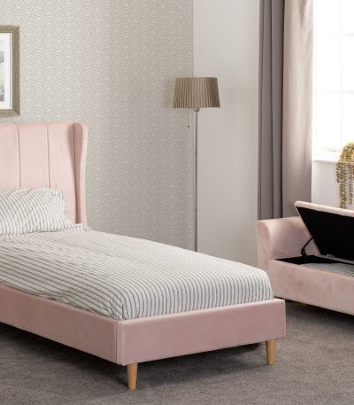 - Amelia Bedframe is made from wood and covered in Pink/Grey Velvet Fabric
