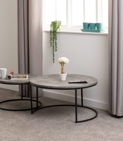 - The Athens Round Coffee Table Set is space-saving as the two tables slot into each other